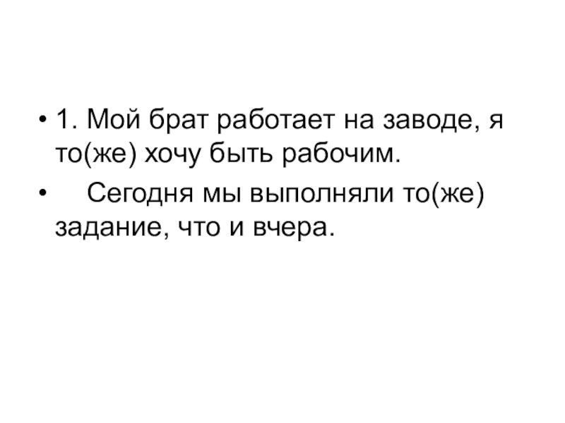 Слайд 21. Мой брат работает на заводе, я то(же) хочу быть рабочим.