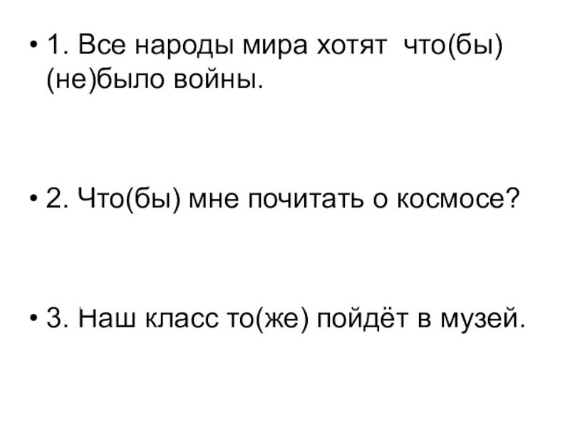 1. Все народы мира хотят что(бы) (не)было войны.2. Что(бы) мне почитать о космосе?3. Наш класс то(же) пойдёт