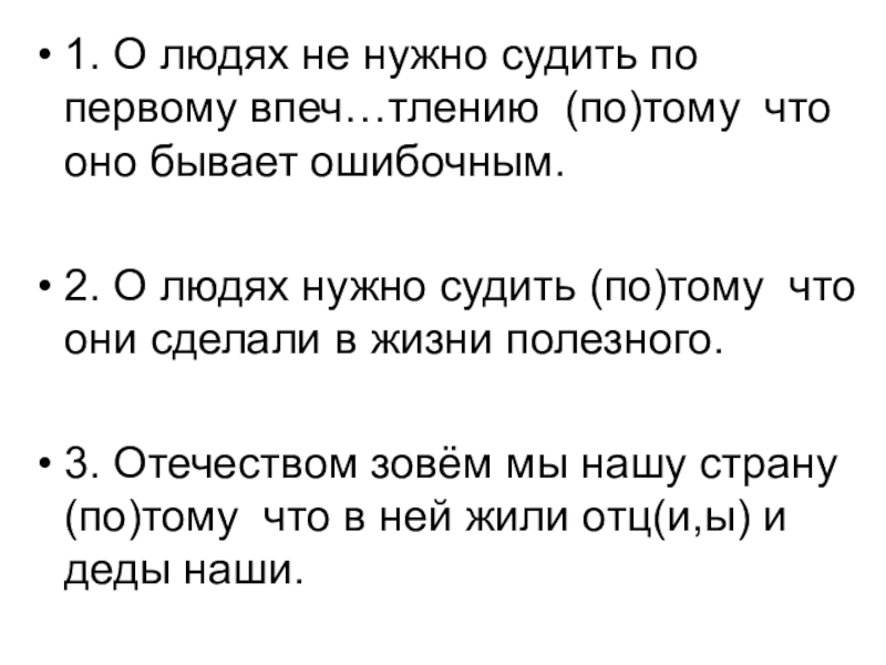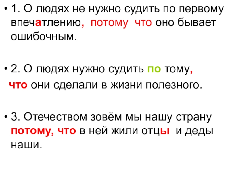 1. О людях не нужно судить по первому впеч…тлению (по)тому что оно бывает ошибочным.2. О людях нужно