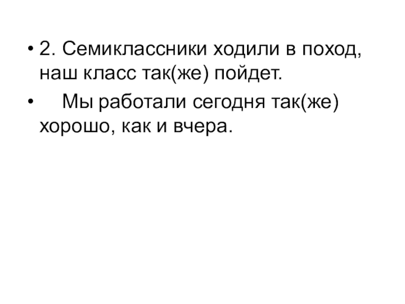 2. Семиклассники ходили в поход, наш класс так(же) пойдет.  Мы работали сегодня так(же) хорошо, как и