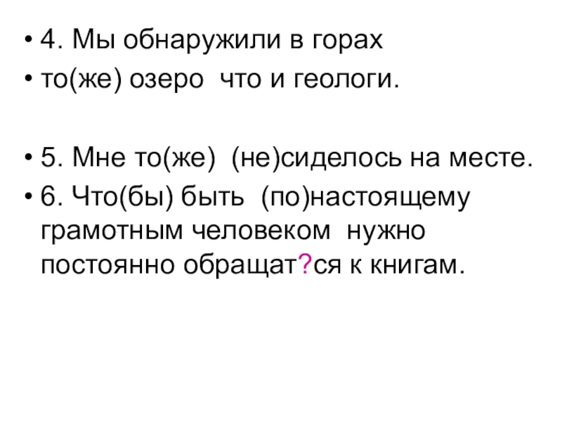 4. Мы обнаружили в горах то(же) озеро что и геологи.5. Мне то(же) (не)сиделось на месте.6. Что(бы) быть