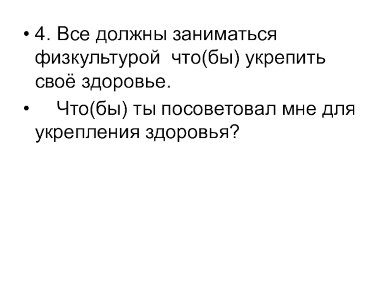4. Все должны заниматься физкультурой что(бы) укрепить своё здоровье.  Что(бы) ты посоветовал мне для укрепления здоровья?