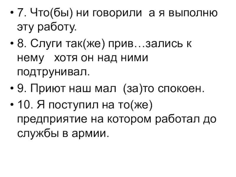 7. Что(бы) ни говорили а я выполню эту работу.8. Слуги так(же) прив…зались к нему  хотя он