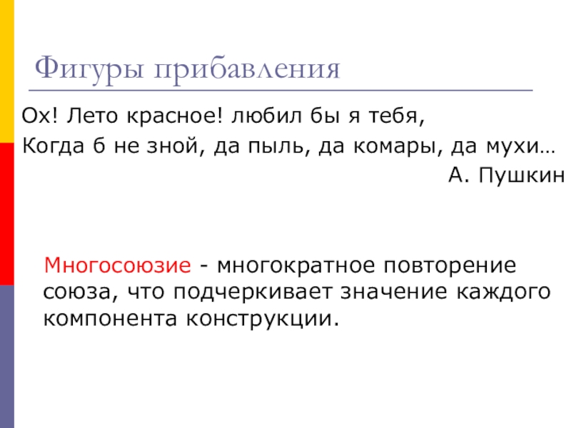 Многосоюзие - многократное повторение союза, что подчеркивает значение каждого компонента конструкции.