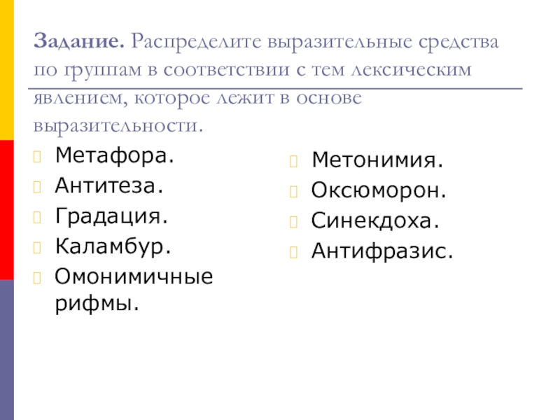 Слайд 10Задание. Распределите выразительные средства по группам в соответствии с тем лексическим
