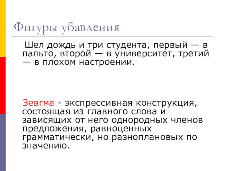 Зевгма - экспрессивная конструкция, состоящая из главного слова и зависящих от него однородных членов предложения, равноценных грамматически, но разноплановых по значению.