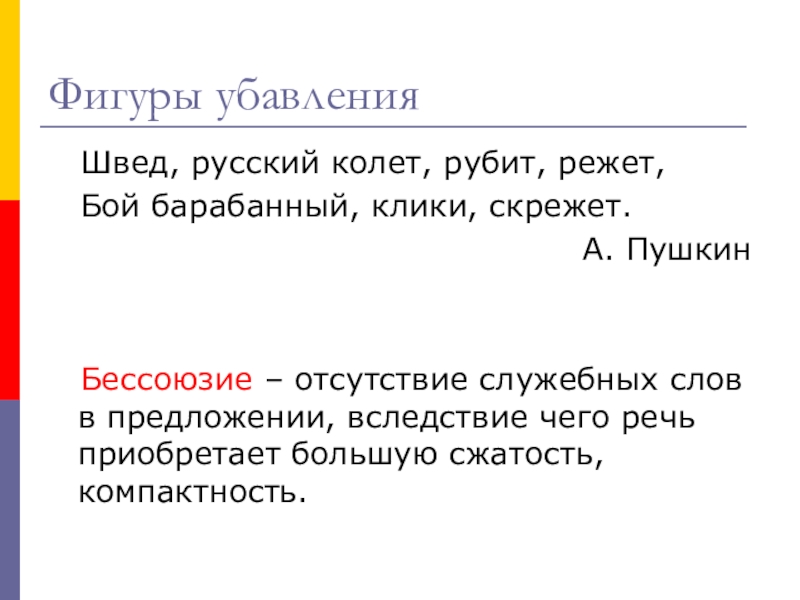 Бессоюзие – отсутствие служебных слов в предложении, вследствие чего речь приобретает большую сжатость, компактность.