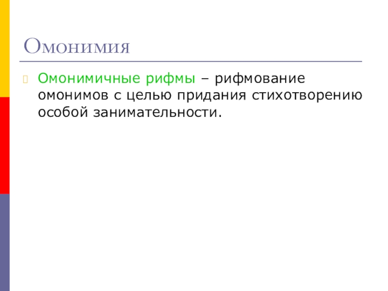 Омонимичные рифмы – рифмование омонимов с целью придания стихотворению особой занимательности.