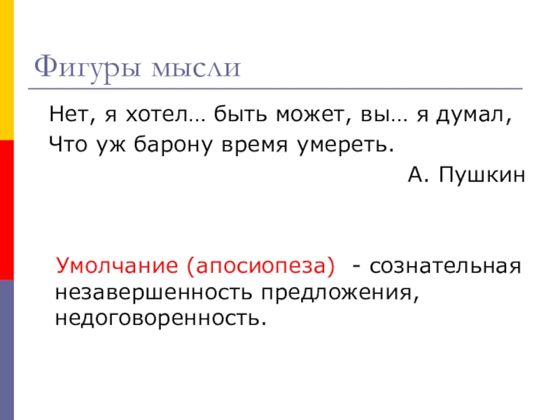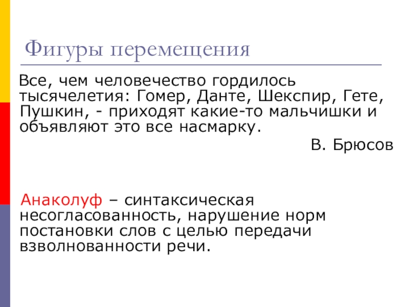 Анаколуф – синтаксическая несогласованность, нарушение норм постановки слов с целью передачи взволнованности речи.