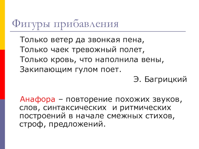 Анафора – повторение похожих звуков, слов, синтаксических и ритмических построений в начале смежных стихов, строф, предложений.