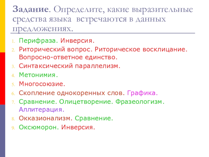 Слайд 42Задание. Определите, какие выразительные средства языка встречаются в данных предложениях.