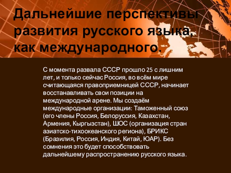 25 с лишним лет, и только сейчас Россия, во всём мире считающаяся правоприемницей СССР, начинает восстанавливать свои позиции на международной арене. Мы создаём международные организации: Таможенный союз (его члены Россия, Белоруссия, Казахстан, Армения, Кыргызстан), ШОС (организация стран азиатско-тихоокеанского региона), БРИКС (Бразилия, Россия, Индия, Китай, ЮАР). Без сомнения это будет способствовать дальнейшему распространению русского языка.