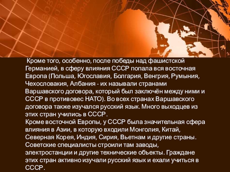влияния СССР попала вся восточная Европа (Польша, Югославия, Болгария, Венгрия, Румыния, Чехословакия, Албания - их называли странами Варшавского договора, который был заключён между ними и СССР в противовес НАТО). Во всех странах Варшавского договора также изучался русский язык. Много выходцев из этих стран учились в СССР.