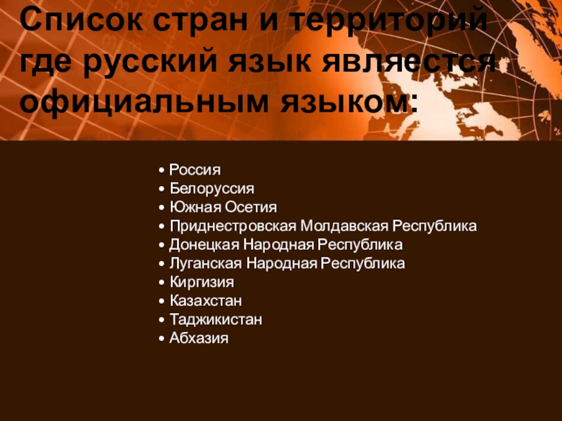 Слайд 4Список стран и территорий где русский язык являестся официальным языком: