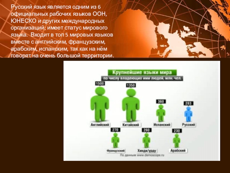 и других международных организаций; имеет статус мирового языка. Входит в топ 5 мировых языков вместе с английским, французским, арабским, испанским, так как на нём говорят на очень большой территории.