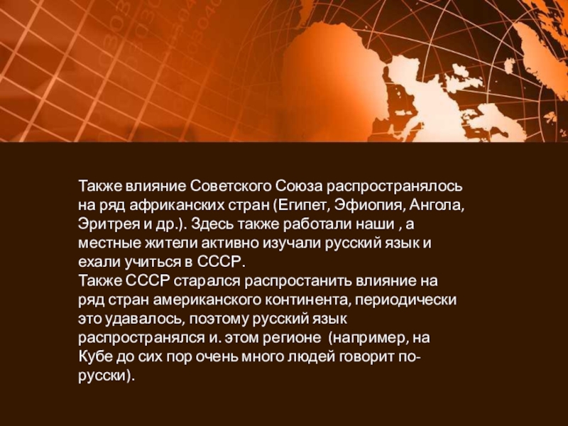 Также СССР старался распростанить влияние на ряд стран американского континента, периодически это удавалось, поэтому русский язык распространялся и. этом регионе (например, на Кубе до сих пор очень много людей говорит по-русски).