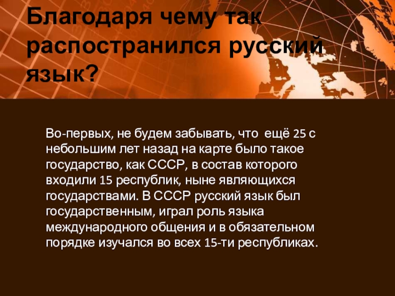 25 с небольшим лет назад на карте было такое государство, как СССР, в состав которого входили 15 республик, ныне являющихся государствами. В СССР русский язык был государственным, играл роль языка международного общения и в обязательном порядке изучался во всех 15-ти республиках.