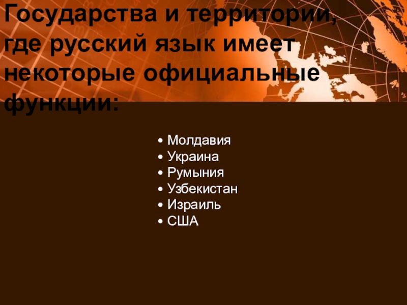Слайд 5Государства и территории, где русский язык имеет некоторые официальные функции: