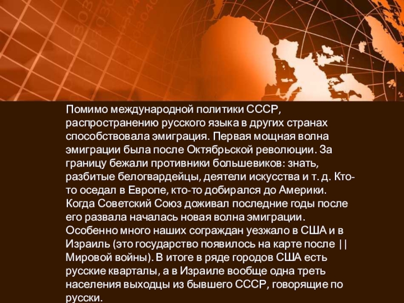 Слайд 9Помимо международной политики СССР, распространению русского языка в других странах способствовала