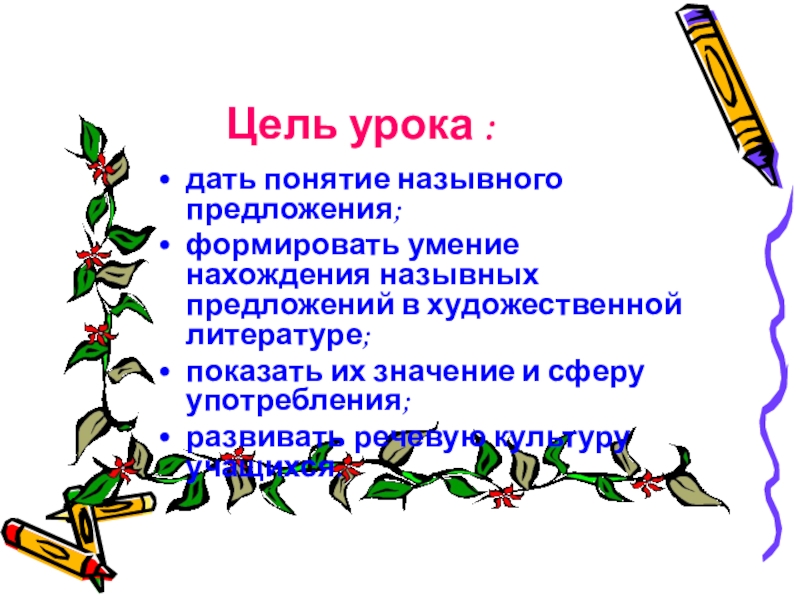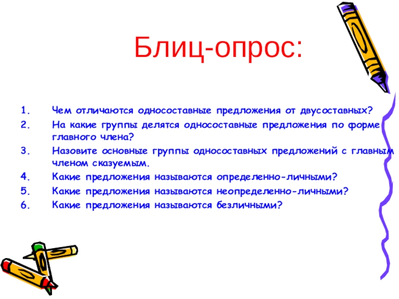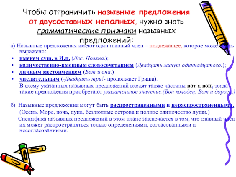 Специфика назывных предложений в этом плане заключается в том, что главный член их может распространяться только определениями, согласованными и несогласованными.