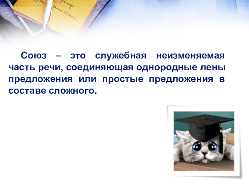 Союз – это служебная неизменяемая часть речи, соединяющая однородные лены предложения или простые предложения в составе сложного.