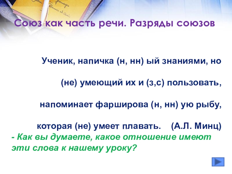 Союз как часть речи. Разряды союзовУченик, напичка (н, нн) ый знаниями, но(не) умеющий их и (з,с) пользовать,напоминает