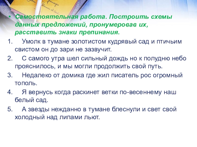 Самостоятельная работа. Построить схемы данных предложений, пронумеровав их, расставить знаки препинания.