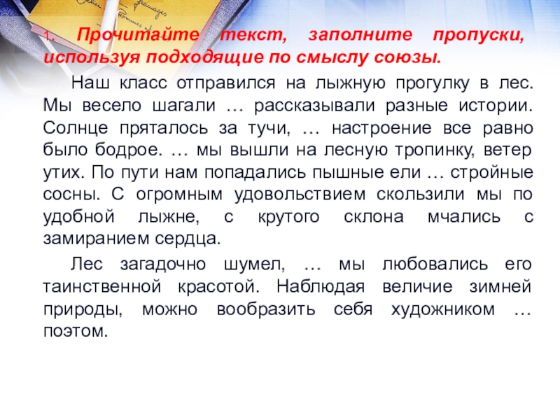 1. Прочитайте текст, заполните пропуски, используя подходящие по смыслу союзы.	Наш класс отправился на лыжную прогулку в лес.