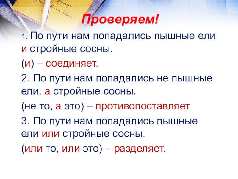 Проверяем!1. По пути нам попадались пышные ели и стройные сосны.(и) – соединяет.2. По пути нам попадались не
