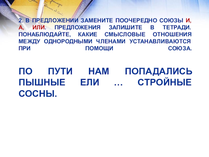 В ТЕТРАДИ. ПОНАБЛЮДАЙТЕ, КАКИЕ СМЫСЛОВЫЕ ОТНОШЕНИЯ МЕЖДУ ОДНОРОДНЫМИ ЧЛЕНАМИ УСТАНАВЛИВАЮТСЯ ПРИ ПОМОЩИ СОЮЗА. ПО ПУТИ НАМ ПОПАДАЛИСЬ ПЫШНЫЕ ЕЛИ … СТРОЙНЫЕ СОСНЫ.