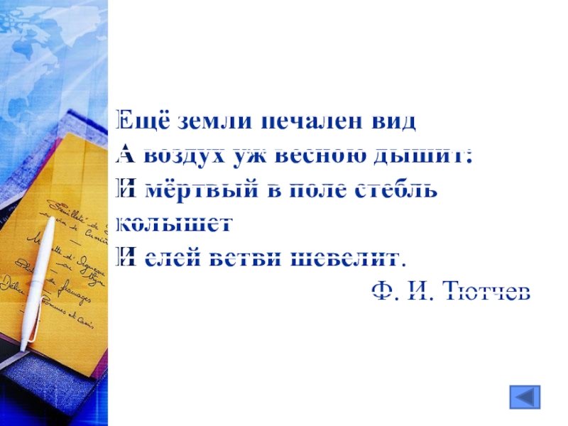 Слайд 4Ещё земли печален вид А воздух уж весною дышит: И мёртвый в поле