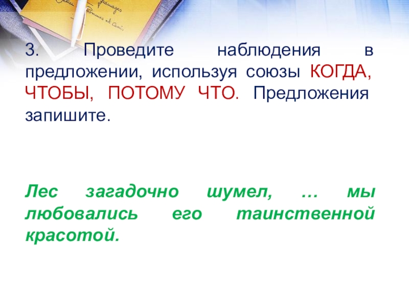 3. Проведите наблюдения в предложении, используя союзы КОГДА, ЧТОБЫ, ПОТОМУ ЧТО. Предложения запишите.Лес загадочно шумел, … мы