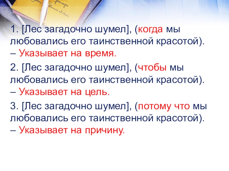 3. [Лес загадочно шумел], (потому что мы любовались его таинственной красотой). – Указывает на причину.