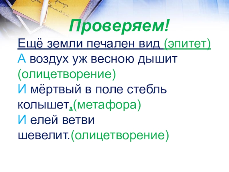 Проверяем!Ещё земли печален вид (эпитет) А воздух уж весною дышит (олицетворение) И мёртвый в поле стебль колышет,(метафора)