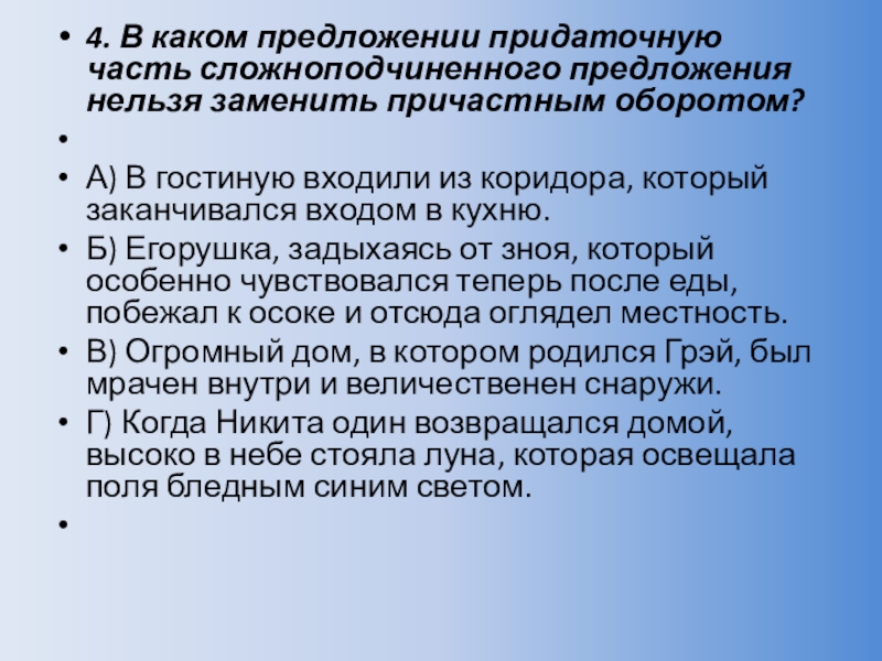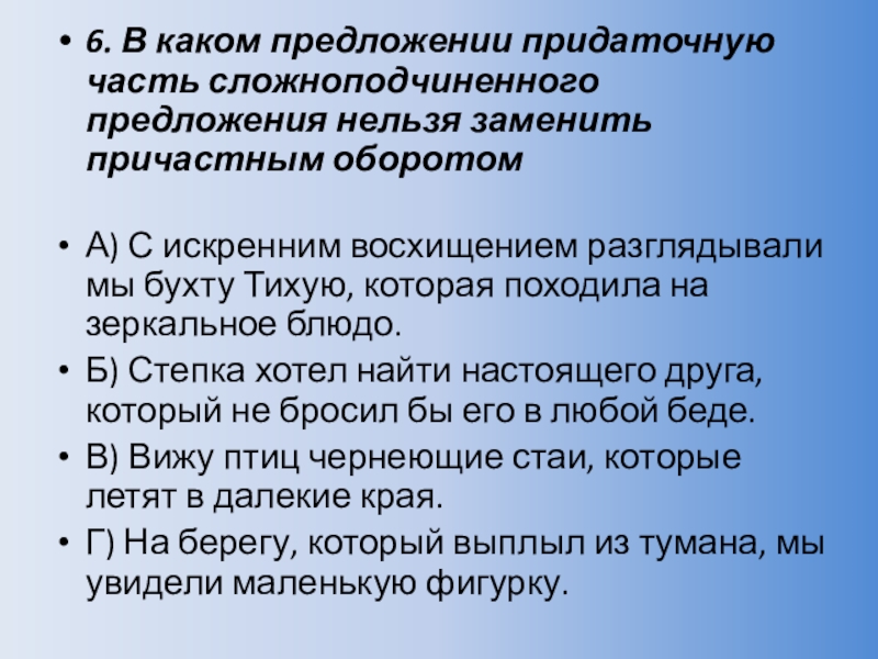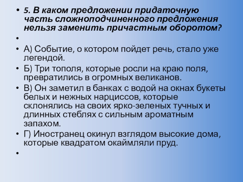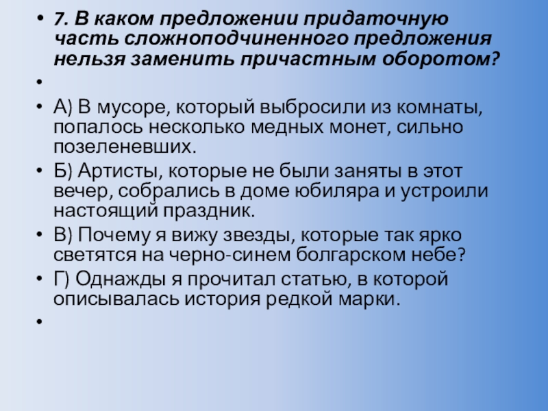 Слайд 234. В каком предложении придаточную часть сложноподчиненного предложения нельзя заменить причастным