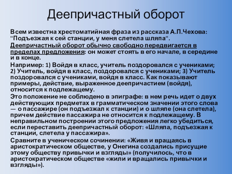 Это положение не соблюдено в эпиграфе: в нем речь идет о двух действующих предметах в грамматическом значении этого слова — о пассажире (он подъезжал к станции) и о шляпе (она слетела), причем действие пассажира не относится к подлежащему. В неправильном построении этого предложения легко убедиться, если переставить деепричастный оборот: «Шляпа, подъезжая к станции, слетела у пассажира».
