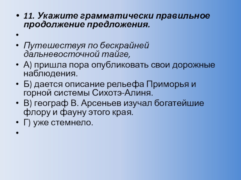Слайд 3011. Укажите грамматически правильное продолжение предложения.