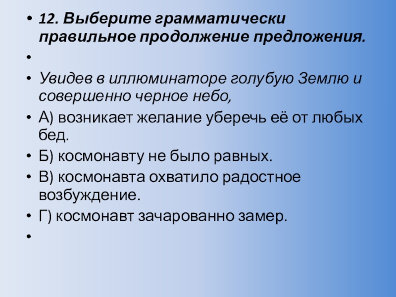 Слайд 3112. Выберите грамматически правильное продолжение предложения.