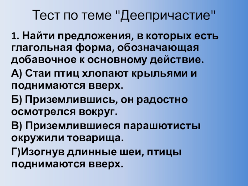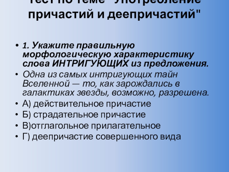 Слайд 20Тест по теме "Употребление причастий и деепричастий"