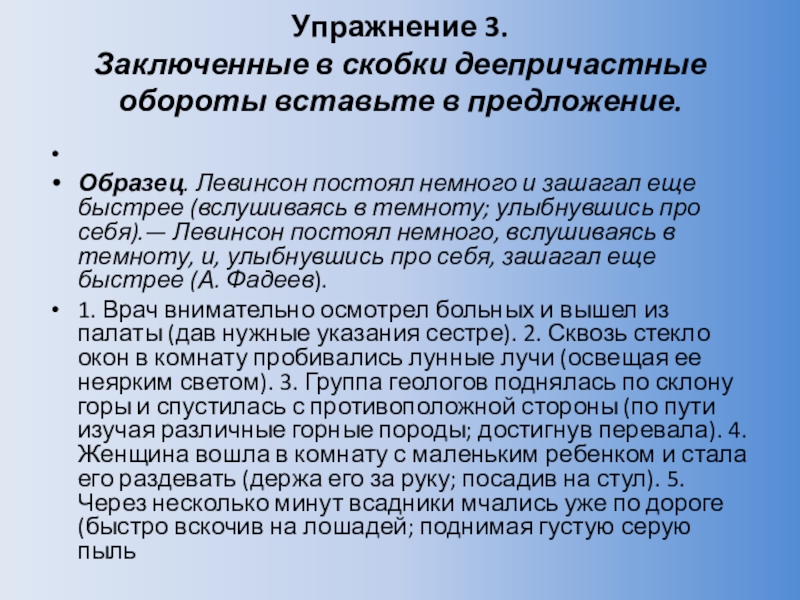 1. Врач внимательно осмотрел больных и вышел из палаты (дав нужные указания сестре). 2. Сквозь стекло окон в комнату пробивались лунные лучи (освещая ее неярким светом). 3. Группа геологов поднялась по склону горы и спустилась с противоположной стороны (по пути изучая различные горные породы; достигнув перевала). 4. Женщина вошла в комнату с маленьким ребенком и стала его раздевать (держа его за руку; посадив на стул). 5. Через несколько минут всадники мчались уже по дороге (быстро вскочив на лошадей; поднимая густую серую пыль