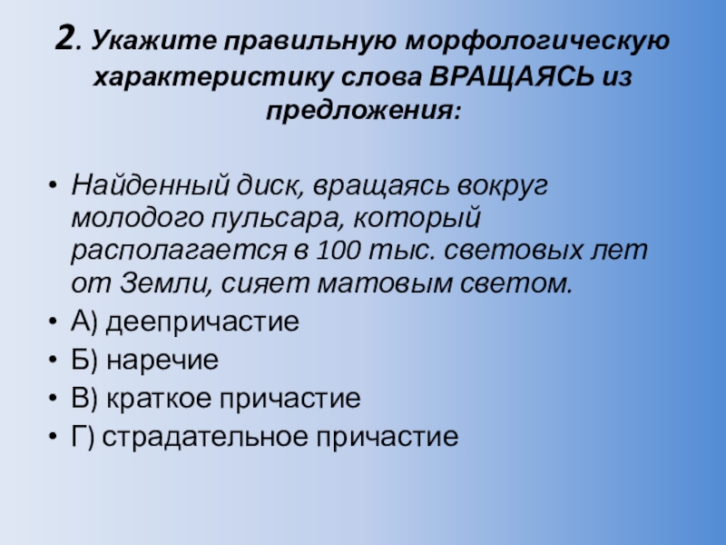 Слайд 212. Укажите правильную морфологическую характеристику слова ВРАЩАЯСЬ из предложения: