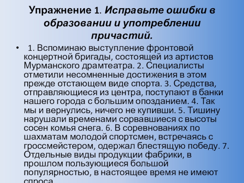 Слайд 14Упражнение 1. Исправьте ошибки в образовании и употреблении причастий.