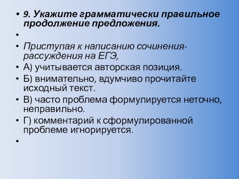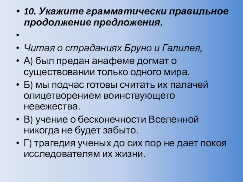 Слайд 2910. Укажите грамматически правильное продолжение предложения.