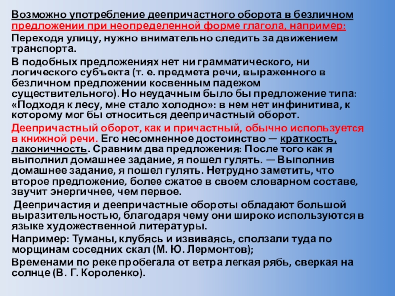 Слайд 13Возможно употребление деепричастного оборота в безличном предложении при неопределенной форме глагола,