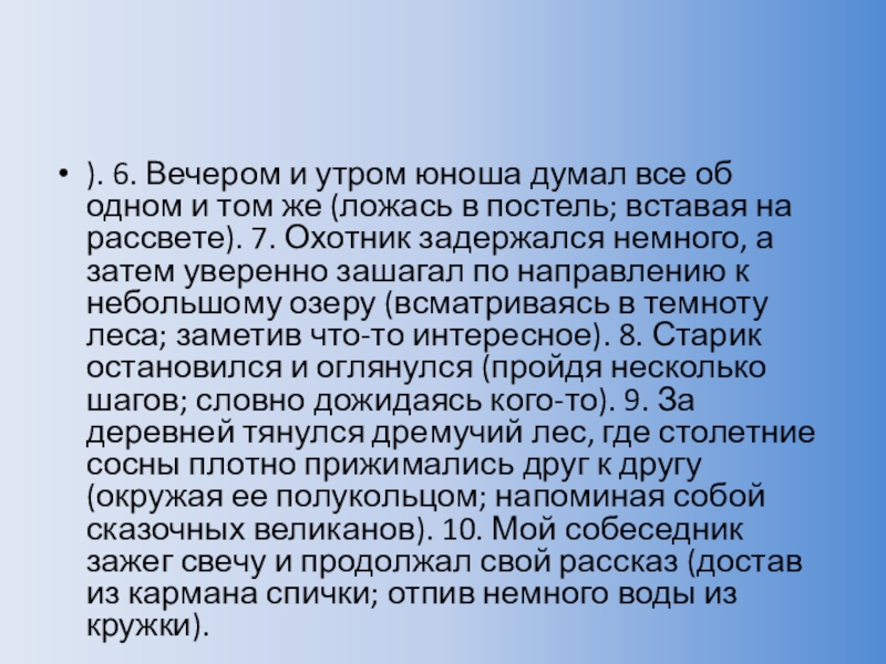 том же (ложась в постель; вставая на рассвете). 7. Охотник задержался немного, а затем уверенно зашагал по направлению к небольшому озеру (всматриваясь в темноту леса; заметив что-то интересное). 8. Старик остановился и оглянулся (пройдя несколько шагов; словно дожидаясь кого-то). 9. За деревней тянулся дремучий лес, где столетние сосны плотно прижимались друг к другу (окружая ее полукольцом; напоминая собой сказочных великанов). 10. Мой собеседник зажег свечу и продолжал свой рассказ (достав из кармана спички; отпив немного воды из кружки).
