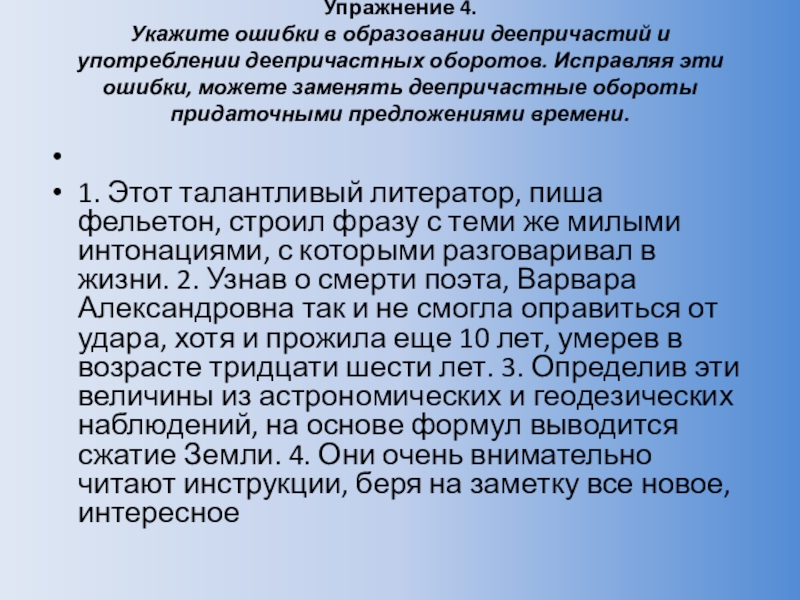 1. Этот талантливый литератор, пиша фельетон, строил фразу с теми же милыми интонациями, с которыми разговаривал в жизни. 2. Узнав о смерти поэта, Варвара Александровна так и не смогла оправиться от удара, хотя и прожила еще 10 лет, умерев в возрасте тридцати шести лет. 3. Определив эти величины из астрономических и геодезических наблюдений, на основе формул выводится сжатие Земли. 4. Они очень внимательно читают инструкции, беря на заметку все новое, интересное