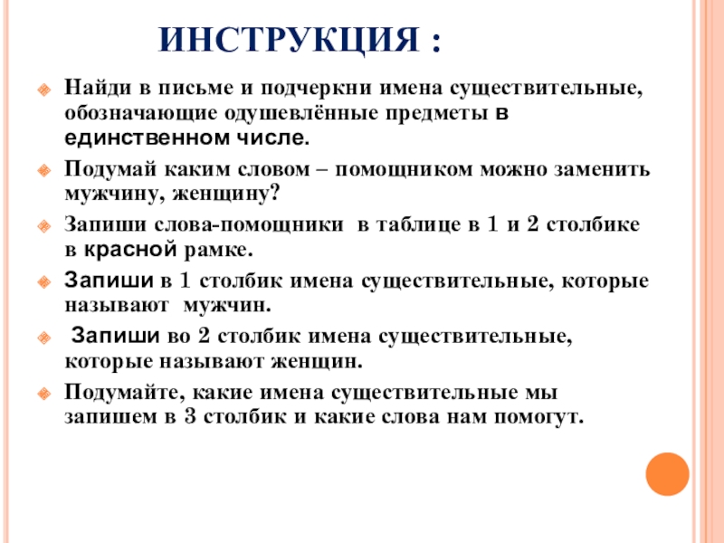 ИНСТРУКЦИЯ : Найди в письме и подчеркни имена существительные, обозначающие одушевлённые предметы в единственном