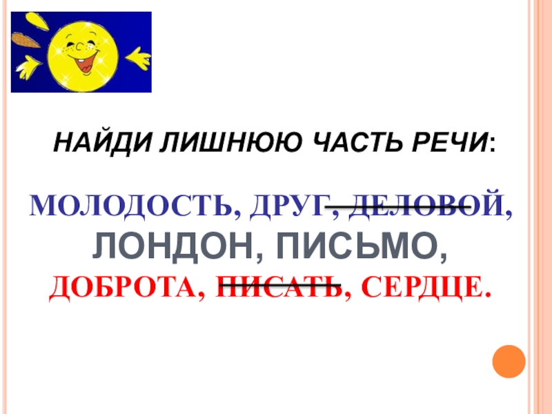 Слайд 4 НАЙДИ ЛИШНЮЮ ЧАСТЬ РЕЧИ: МОЛОДОСТЬ, ДРУГ, ДЕЛОВОЙ, ЛОНДОН, ПИСЬМО, ДОБРОТА,