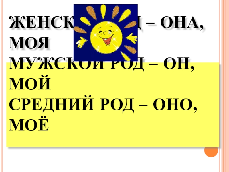 ЖЕНСКИЙ РОД – ОНА, МОЯ МУЖСКОЙ РОД – ОН, МОЙ СРЕДНИЙ РОД – ОНО, МОЁ