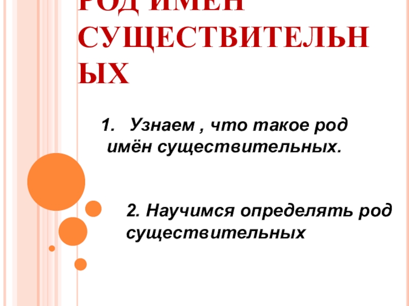 РОД ИМЕН СУЩЕСТВИТЕЛЬНЫХ Узнаем , что такое род имён существительных.2. Научимся определять род существительных